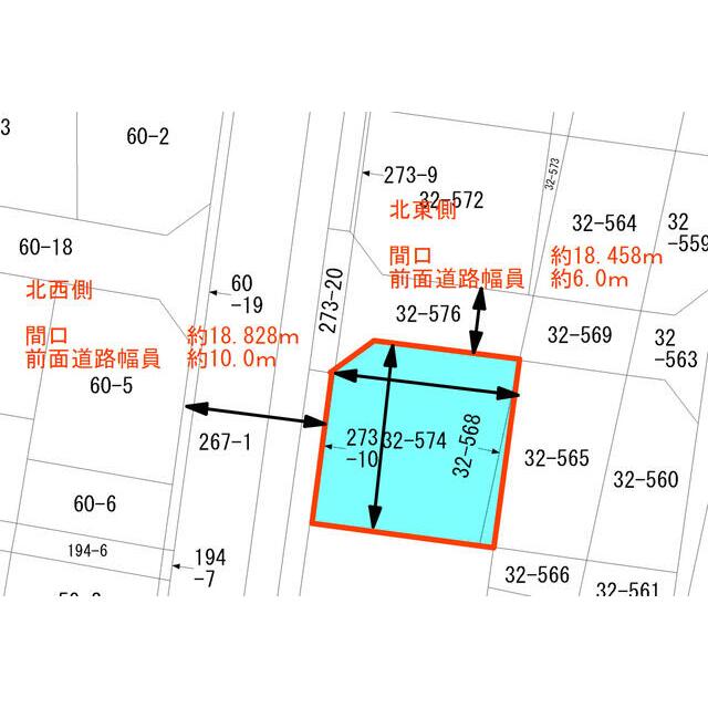 | 土地権利 | 所有権 | 接道状況 | 角地:2方道路 北西10.0m 公道 接面18.8m 北東6.0m 公道 接面18.4m |