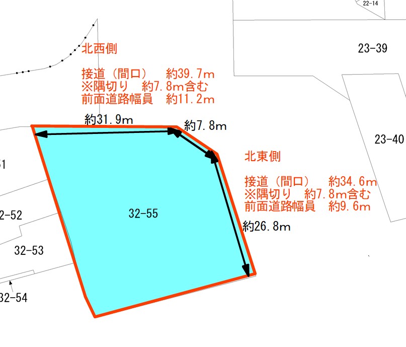 | 接道状況 | 北西11.2m 公道 接面39.7m 北東9.6m 公道 接面34.6m | 地目 | 宅地 |